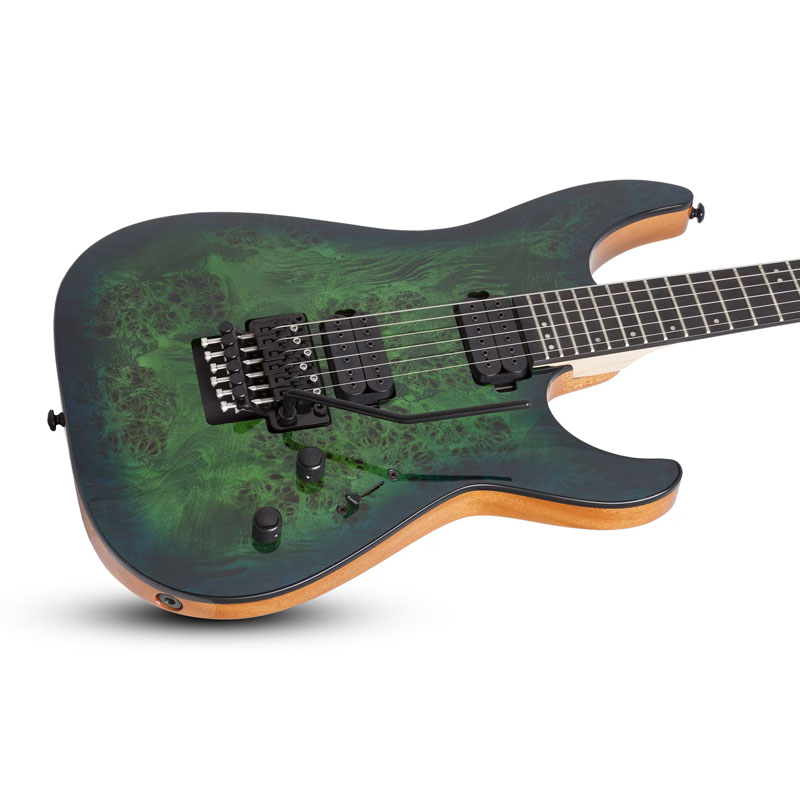 The Pro Series features a visually striking maple burl top on a mahogany body. The neck is made of maple and bolted, while the fretboard is made of wenge. There are Schecter Diamond Decimator pickups in the bridge and the neck position. The bridge is a Schecter Custom Hardtail with string-thru body construction or a Floyd Rose Special 'Hot Rod' Locking Tremolo.