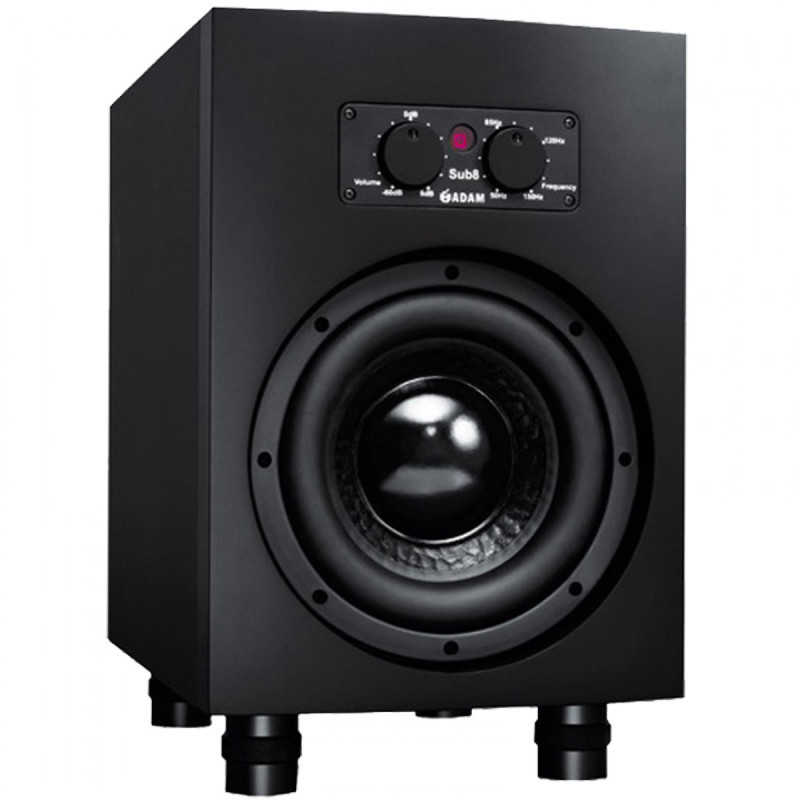 Designed for smaller control rooms up to 20 square meters, the ADAM Audio Sub8 is a compact yet powerful subwoofer that extends the low-frequency range of any nearfield monitoring system down to 28Hz. The Sub8 houses a robust 8.5" woofer with a 1.5" voice coil driven by a 160W ICE Power amplifier which combines low heat generation with high performance to handle maximum power levels during marathon sessions. The front baffle is fitted with two motorized knobs that let you tweak the input level and crossover frequency settings — which can also be controlled via the included wireless remote — to optimize your monitor setup from your preferred listening position. The Sub8 pairs perfectly with ADAM Audio's AX Series nearfield monitors.
